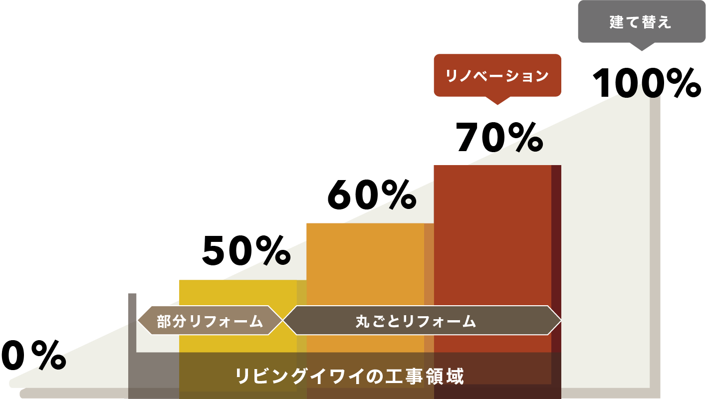 子供たちが巣立ち、夫婦二人の生活になりLDKと水まわりだけ気分一新リノベーションしたい。孫も遊びに来るから耐震・断熱性能も気になる。そんなお客様におすすめのプランです。